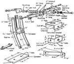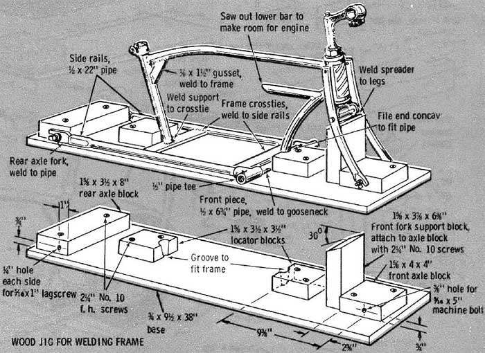 Fasten the front and reat forks to the blocks on the jib, and you are now ready for welding. Shape the crossties as shown for a close fit inside the side rails. For clean welds, remove the paint from all weld points. Tack weld all joints to hold the assembly rigid, then remove the frame from the jig to complete the welding. Tack the threaded joints at the T's to prevent their twisting.