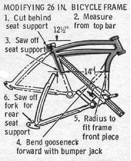 Start by cutting the bike frame so you come out with the portion shown in fig. 2. It's probably necessary to bend the "gooseneck" section of the frame forward to make room for the engine.