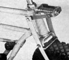 The spring-action front wheel is made by cutting the legs off a regular bike fork. Bolt the legs to this stub fork as shown, with the spreader bar inserted between them. The upper ends of the legs, which now extend above the fork, are anchored to a spring that bears against a plate on the steering column. As the legs pivot on the fork, they compress the spring, giving the front wheel a sof, cushiony suspension. See figs. 5 & 6.