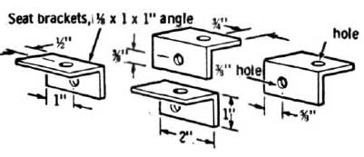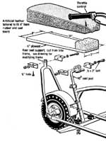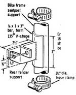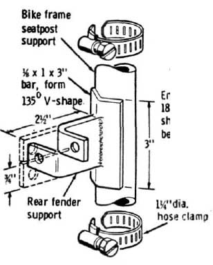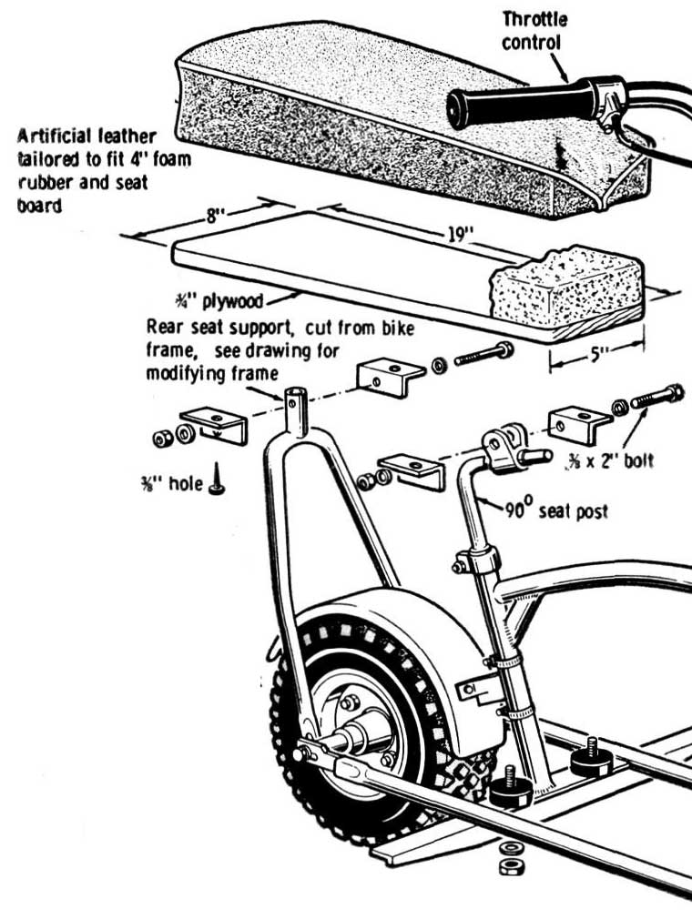 You can make your own two-passenger seat as shown in fig. 1, or buy one from the parts houses. The seat will mount in the rear to a support made from the rear fork (fig. 3) that was cut off the bike frame, or fabricated yourself. A 90 degree seat post, a stock bicycle item, is needed to move the front seat mount farther forward. If this is unavailable, improvise.