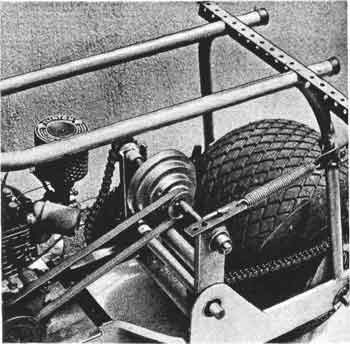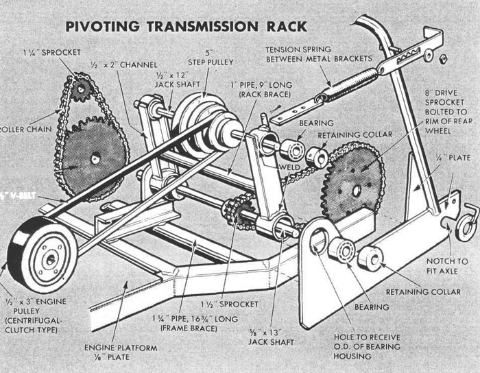 The two uprights are welded to opposite ends of a pipe brace; the jack shafts are slipped through the bearings and held fast with retaining collars. This entire assembly is mounted in the frame by means of simple mechanical pivots.