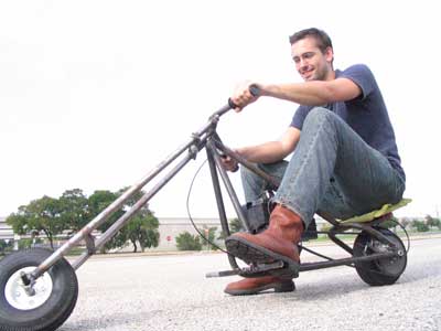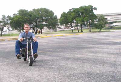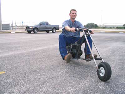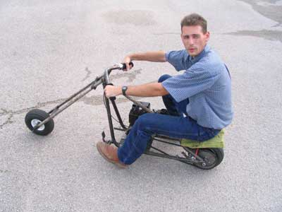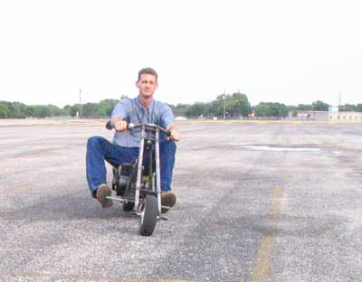 We used a 3 HP B&S engine for the project. This was enough power for us to clock the chopper at 27 MPH with a 200 pound rider! The rake is pretty extreme, but the handling is good enough to be quite enjoyable.