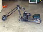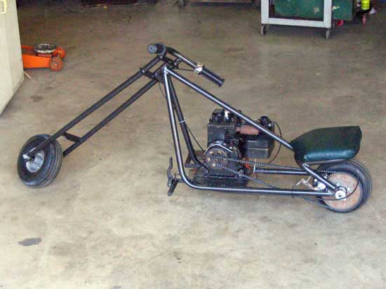 Secondly, the longer you go with the forks, the more the material will flex on bumps. For a pocket sized chopper, the forks aren't too long. But the larger the mini bike, and the longer the forks, the farther the front wheel will be from the frame. This flex must be considered. Gussets and thick material are your solution, but at some point you'll reach "too long" — you are limited by material and welding ability, not imagination.