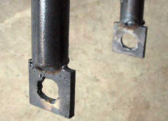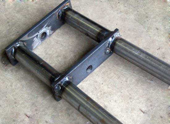 To make the forks without a large diameter drill involves a lot of welding. Ideally, one would cut two pieces of 1.5" flat stock, drill through them and then slide the fork tubes through the holes.