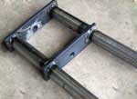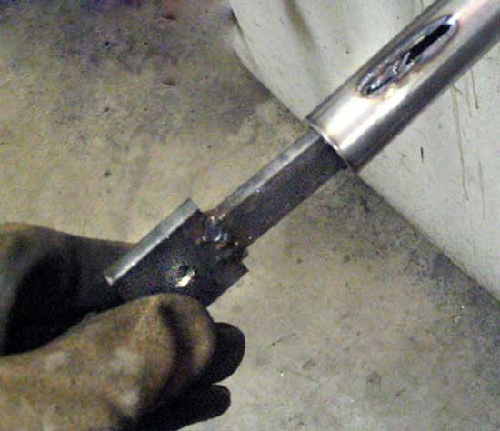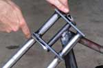 The axle tabs were then inserted into the forks (Fig. 4). Some material was ground off the inserted portion and the fit was very tight. The tabs were then welded in place at the bottom and up the back at the slit for maximum safety.