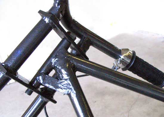 After mocking up the forks, wheels, and frame, and ensuring that all the toleranaces were correct, a strengthening gusset was welded to the neck tube (Fig. 8). This is critical for adding needed strength, as the long rake will put serious stress on the neck tube.