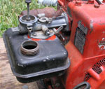 The second engine displayed is also a 3 HP, but has a larger tank and slightly more advanced carb. There are two down tubes on the carb. One draws gas from the tank and deposits it in the smaller bowl that's integrated into the tank. This allows the second tube to always have a constant level of gas to pull from, whereas the first example, when on a sharp incline with low fuel may suck air.