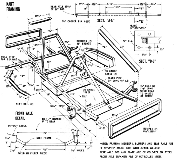include "/srv/www/www.diygokarts.com/top-ads.html"; ?>These frame plans are for a one seat go kart, but they're really just for your starting reference anyway. They use 1" angle for the frame. This has the advantage of being easy to bend. We like using square for the frame, and angle where it's needed, but to each is to own.