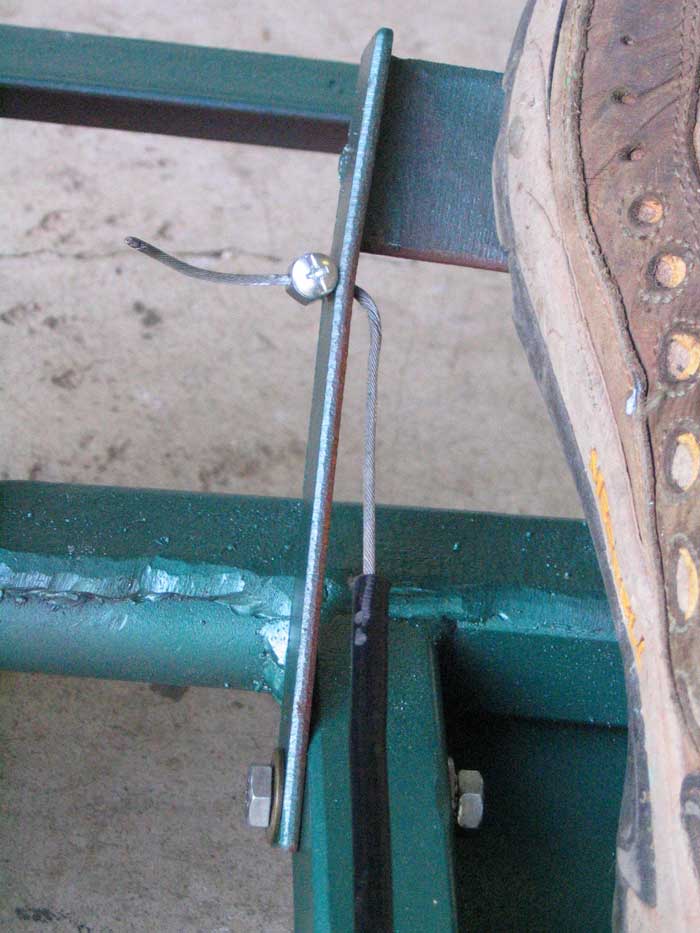A tab was welded to the frame, and a hole was drilled through (fig. 2) to help route the cable and keep it properly aligned. The free end of the cable is secured to the pedal with a wire nut, shown in fig. 3.