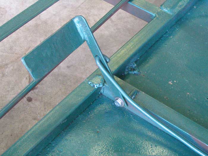 The front band attaches to the frame on a small post which is welded to the frame. In fig. 2 you can see the post that is welded to the frame. Slide the band over this post, secure, and then slide the sprocket/brake drum assembly into place.