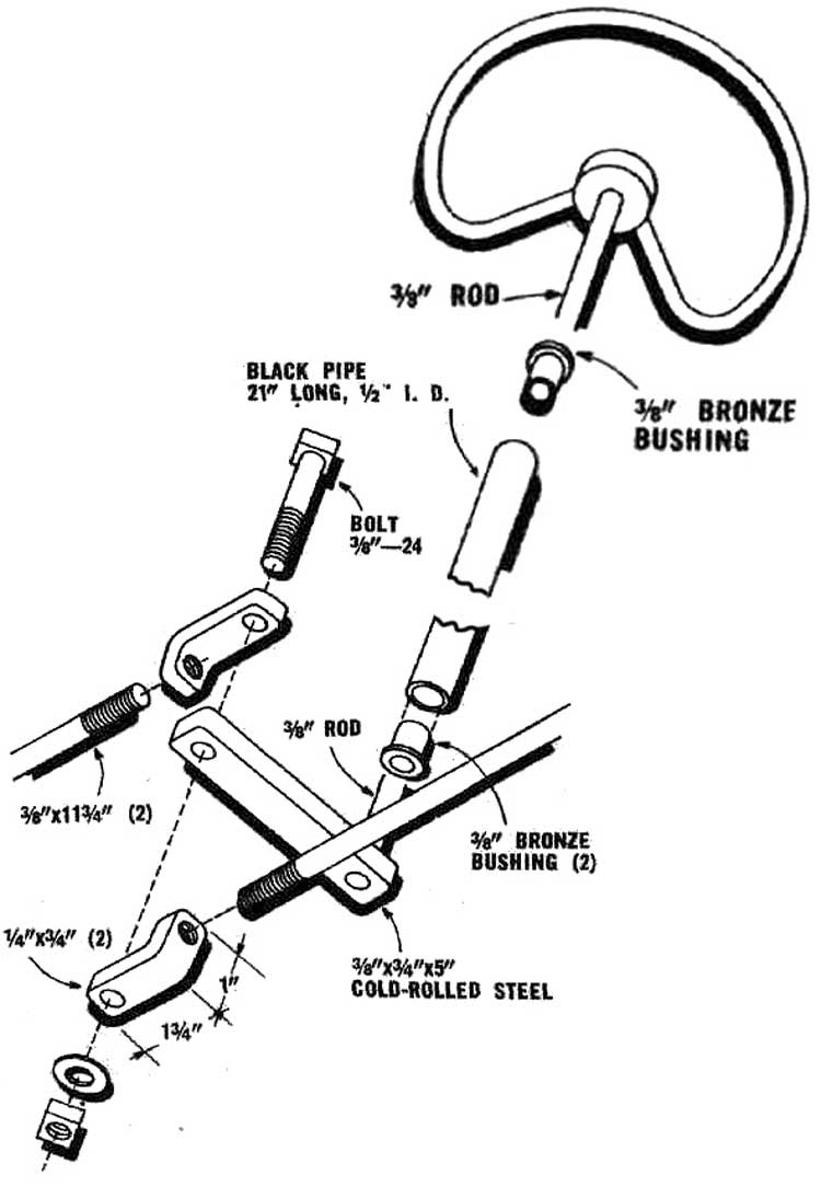 To make your own tie rods, simply take 1/4" x 3/4" x 1.5" flat stock and make the "U" shape in the Fig. 5. Use an inside diameter of about 7/16" to allow movement and the inclusion of an adjustment nut.