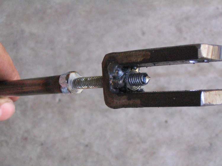 At least one end of your tie rod needs to be adjustable so you may align your steering properly. Once you've completed the "U", drill a 1/4" hole in the short side and weld a 1/4" bolt inside. (See Fig. 5).